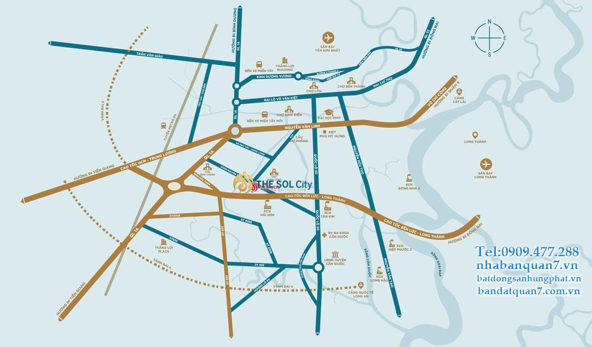 Dự án The Sol City được đánh giá là sở hữu vị trí chiến lược khi có cao tốc Bến Lức – Long Thành chạy ngang qua. Kết nối dễ dàng với cao tốc Bến Lức – Long Thành, đường song hành QL50, cao tốc TP.HCM – Trung Lương, Quốc lộ 1A, đường ĐT 835B,…